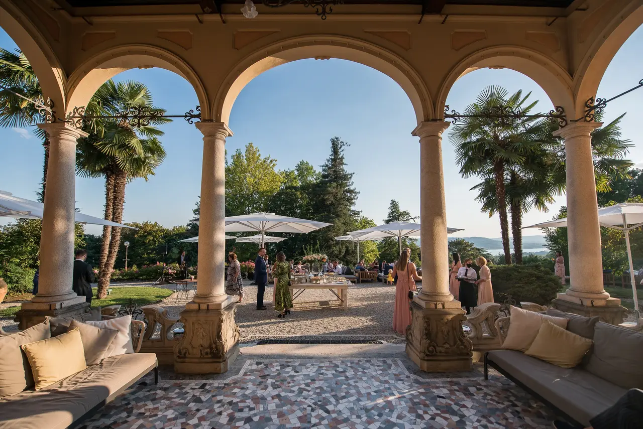 Tra i viali del parco storico-botanico. Un brindisi all'aria aperta, con la villa che fa da sfondo.